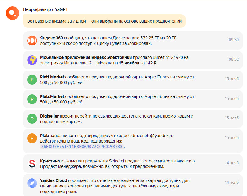 Сегодняшнее утро началось с удивительной новости в Яндекс.Почте. У меня появился "Нейрофильтр с YaGPT". Суть фильтра - он читает мои письма и делает выжимку по ним... Еще раз - искусственный интеллект Яндекса перерабатывает, возможно, очень конфиденциальную информацию через какие-то непонятные сервера и дальше показывает ее сразу после входа в почту. Сейчас на экране нет того, чего бы я хотел скрыть от кого-то, но тем не менее - вы видите все сами. Цифры, даты, конкретика... Кажется, Яндекс делает что-то плохое. #яндекс #yandex #яндекспочта #yandexmail #mailyandex #email #gpt #llm #yagpt #нейрофильтр