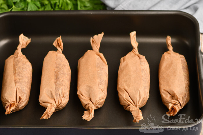 Затем переворачиваем колбаску швом вверх и концы бумаги скручиваем. Перекладываем в форму. Запекаем в разогретой духовке (средний уровень) при 180 градусах 30 минут.
