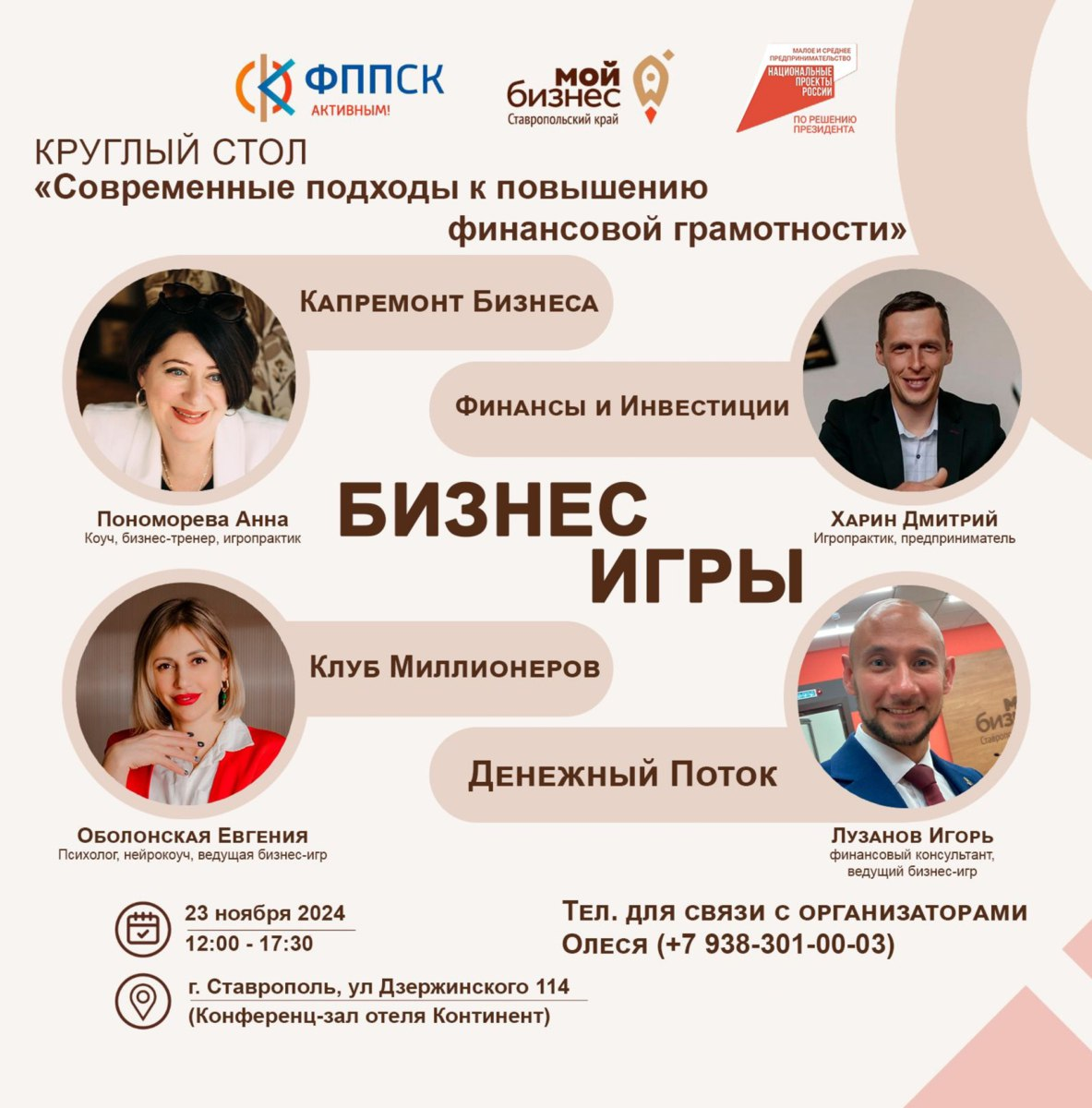 ❗️🚀 Специально для предпринимателей Ставропольского края центром «Мой бизнес», функционирующим на базе некоммерческой организации «Фонд поддержки предпринимательства в Ставропольском крае», Центром кластерного развития, 23.11.24 с 12:00 до 17:30 будет проводиться круглый стол «Современные подходы к повышению финансовой грамотности». УЧАСТИЕ БЕСПЛАТНОЕ! ⬇️ ЧТО ВАС ЖДЕТ НА КРУГЛОМ СТОЛЕ: Четыре финансовых тренинга: 🔸 «КАПРЕМОНТ БИЗНЕСА» 🔸 «ДЕНЕЖНЫЙ ПОТОК» 🔸 «ФИНАНСЫ И ИНВЕСТИЦИИ» 🔸 «КЛУБ МИЛЛИОНЕРОВ» Стратегические бизнес-тренажеры - оптимальный инструмент по развитию системного эффективного мышления и решению бизнес-задач. Каждый предприниматель знает, как зарабатывать деньги, а с помощью тренинга узнает, как создать капитал, сохранить заработанное, инструменты диверсификации капитала. 📢 Ведущие спикеры: ● ПОНОМАРЕВА АННА МИХАЙЛОВНА - сертифицированный коуч, сертифицированный психоаналитический психолог, бизнес-тренер. Игропрактик – ведущая игр «Капремонт бизнеса», «Самосаботаж».