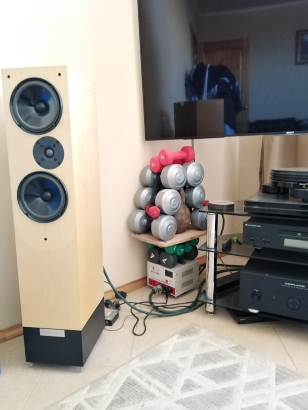 Особое внимание нужно уделить полке на которой стоит аппаратура, она должна быть тяжелой, в данном случае я использую сыпучий пригруз весом 180 кг. это необходимо, чтобы компенсировать полку как резонансную систему (исключить ее влияние на звук), что дает потрясающий и быстрый результат, на стандартных легких полках из дерева никогда не получить отличный звук это утопия, легкие полки это бесконечный источник резонансов а резонансы крайне губят звук они разрушают его полностью из этого и выводы будут ложные, поэтому полки лучше заказывать из плит каменных с жесткой геометрией (лучше сварные из коробчатого профиля например), можно использовать камень, или фибробетон (фибробетон не требует армирования, фибру надо использовать синтетическую не металл). Вес полок должен быть как минимум 180 кг только тогда будет результат, потому как если вес блоков больше полок, то результата не будет, резонансы от этих полок будут передаваться на блоки, что особенно важно и для винилового проигрывателя (поэтому дорогие модели отличаются огромным весом, если полка тяжелая то Вы создаете базу для проигрывателя, т.е. поступаете аналогично как в очень дорогих проигрывателях).