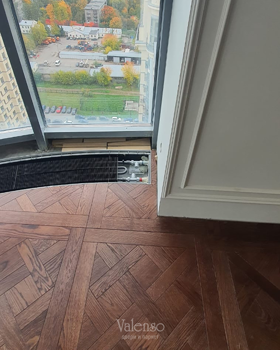 Для этой квартиры, расположенной в Санкт-Петербурге в ЖК «Граф Орлов» мы изготовили и уложили модульный паркет. Паркет выполнен из натурального дуба в тонировке согласно дизайн-проекту интерьера. В этом решении мы использовали одну породу дерева с одинаковой тонировкой, мы подбирали разные текстуры и сочетания дерева, чтобы узор модуля «заиграл». В гостиной окна в пол и мало того что они имеют радиусную форму, в полу предусмотрены конвекторы также повторяющие радиус размещения окон. Дополнительной задачей был аккуратный монтаж примыкания модульного паркета, состоящего из нескольких элементов в каждом модуле и конвекторов в полу. В этой квартире ещё идёт ремонт, но уже сейчас видно, насколько интересный получается союз модульного паркета из дуба на полу и гипсовой лепнины на стенах. Авторы интерьера — бюро дизайна и архитектуры Ольги Кулекиной — New Interior (@newinterior_ok) #valenso #паркетдуб #модульныйпаркет #паркетиздуба #паркетназаказ #паркетныйпол #наборныйпаркет #производствопар