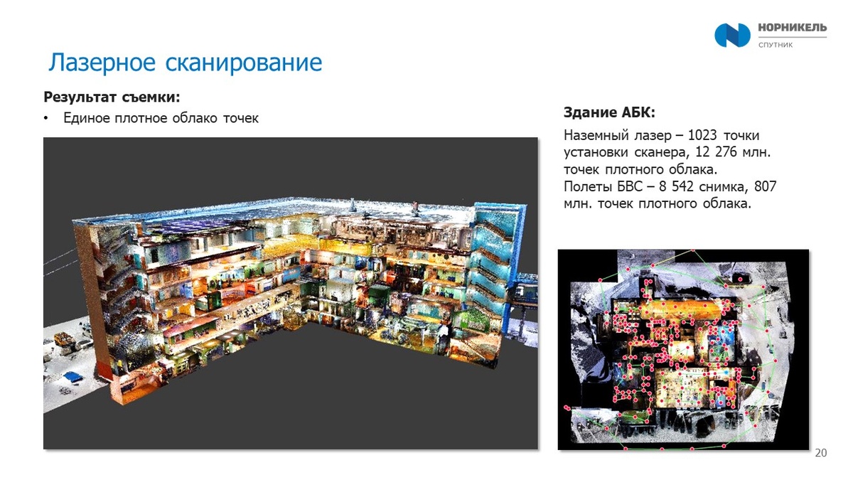 ООО «Беспилотные технологии» весь 2024 год выполняло и продолжает выполнять большой перечень работ для ГК Норникель. Одним из таких видов работ стало создание единого плотного облака зданий с сооружений. Заказчику требовалось чтобы его объекты были отсканированы внутри, снаружи, объединены и загружены единым файлом. Тысячи точек стояния наземного лазера, десятки полетов коптерами, более 100 Гб вес плотного облака на один из объектов – все это мы смогли сделать и передать Заказчику. Полученные материалы будут использоваться различными службами ГК Норникель для выполнения своих задач, в т.ч. для проектирования, получения точных планов зданий и помещений, мониторинг текущего состояния объектов и сравнение во времени с последующими съемками, оценка затрат на ремонтные работы, формирование противопожарных планов и планов эвакуации и т.д. Все материалы демонстрируются с разрешения Заказчика.