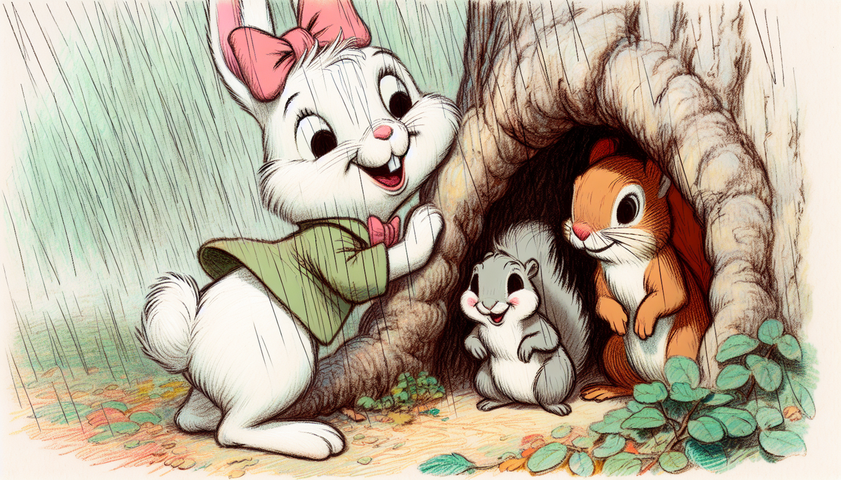 В одном солнечном лесу жила-была жизнерадостная зайчиха Мила. На её ушке красовался яркий розовый бантик, а на лице всегда была улыбка. Мила больше всего на свете любила бегать по лесу, прыгать через цветы и собирать ромашки. У неё были замечательные друзья: мудрый ёжик Топи и любопытная белочка Ласка. Однажды в ясный солнечный день Мила и её друзья собрались на полянке, чтобы поиграть. Но вдруг небо потемнело, и над лесом поднялся сильный ветер. Все животные в лесу начали беспокойно перешёптываться, глядя на облака. — Кажется, надвигается буря. Нам нужно позаботиться о себе и наших друзьях, — сказал Топи, поправляя свои круглые очки. — Да! Мы должны быстро найти укрытие! — воскликнула Мила, дрожа от волнения. Ласка, которая любила бегать по веткам деревьев, задумалась, как помочь друзьям. Её пушистый хвостик развевался на ветру. — Я знаю, где есть большое старое дерево с дуплом! Оно может спасти нас от шторма! — предложила она. — Замечательная идея, Ласка! — воскликнул Топи, с воодуше