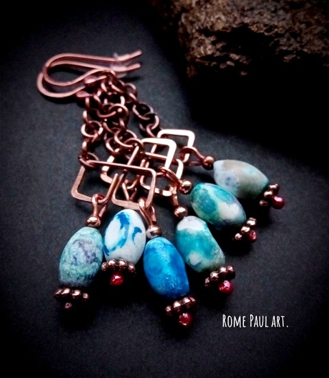 Уникальные бусины африканского агата, ручной аборигенной обработки, и живая кованая медь - энергетическая мощь природы. Эстетика камня практически сохранена. Rustic authenticity. Для ценителей этнических украшений. МАТЕРИАЛЫ: натуральный матовый агат (ручная огранка, ЮАР), кованая живая медь (не вскрыта лаком), толщина швензы 0.8 мм Длина серьги: 65мм ...Небрежный оттенок и неповторимый по своему внешнему виду африканский синий агат, со своими щербинками и потертостями, добавит вашему образу выразительный индивидуальный штрих и сделает акцент на деталях. Кроме того, натуральный экзотичный минерал, сформированный в природе, обладает особой энергетической силой, которая поможет владельцу избежать некоторых заболеваний, а также поможет в трудных жизненных ситуациях. Каплевидные бусины обработаны вручную аборигеном, тем самым приобрели вполне себе аутентичный экзотический вид, став реликвией. В наличии один авторский экземпляр. Предоплата. ЦЕНА ИЗДЕЛИЯ 3200 руб. +Доставка по Р