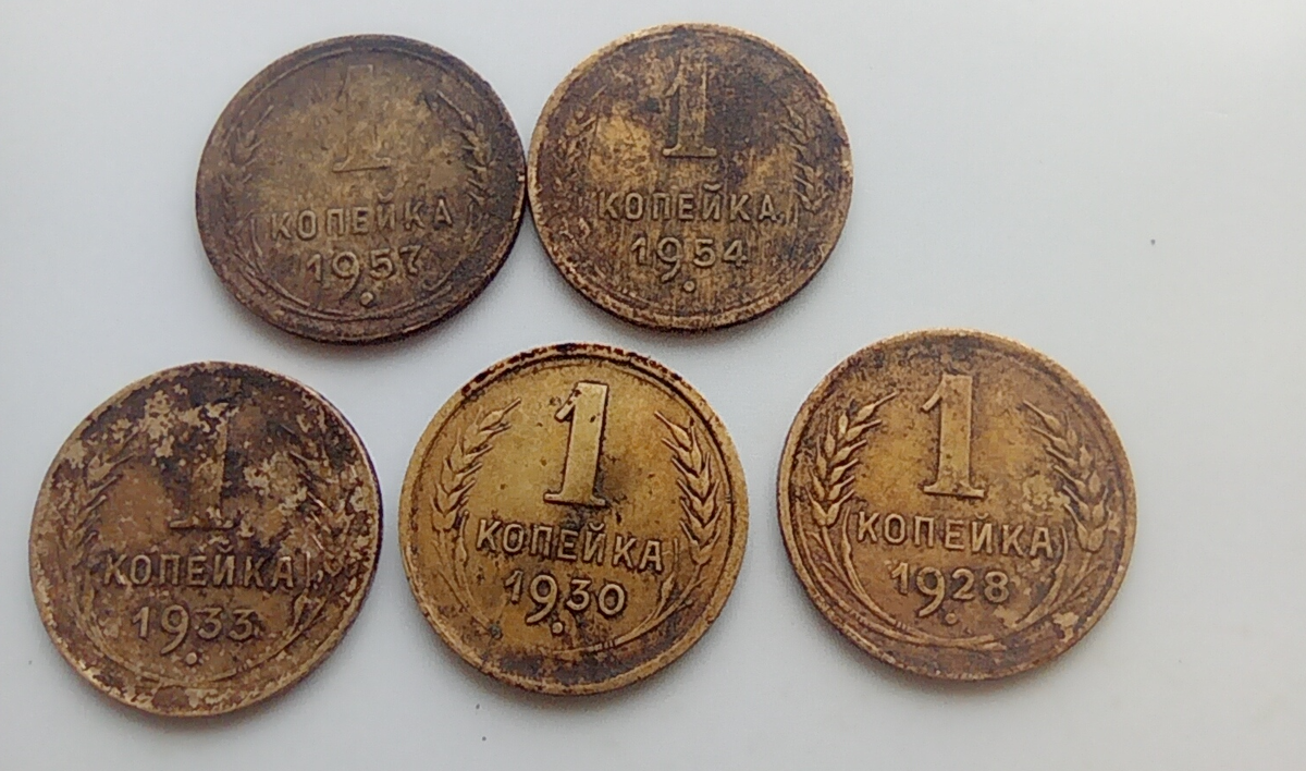 Очередные бронзовые советские монеты, которые можно почистить, так как монетки стоят определенных денежек. На этот раз это копеечки - маленькие монетки, которые попадаются реже прочих бронзовых номиналов, так как их вес и диаметр явно не способствует обнаружению. Года: 1957, 1954, 1933, 1939, 1928. Чищу традиционным для себя способом - размягчаю налет в слабо кислой среде, а затем при помощи мягкой латунной щеточки убираю всё ненужное, чтобы монеты получили одинаковый оттенок. Получилось вот так: Монетки, конечно, поблёскивают, но уже черед год они примут вот такой оттенок (как монетки в нижнем ряду): 1957 год - около 70 рублей. 1954 год - около 90 рублей. 1933 год - около 250 рублей. 1930 год - около 500 рублей 1928 год - около 300 рублей. Данные цены являются среднерыночными, но минимальными. И это я еще не просматривал на разновидности, хотя следовало бы. В следующей публикации этим и займусь. Если посмотреть на различных ресурсах продажи советских монет, в частности, бро