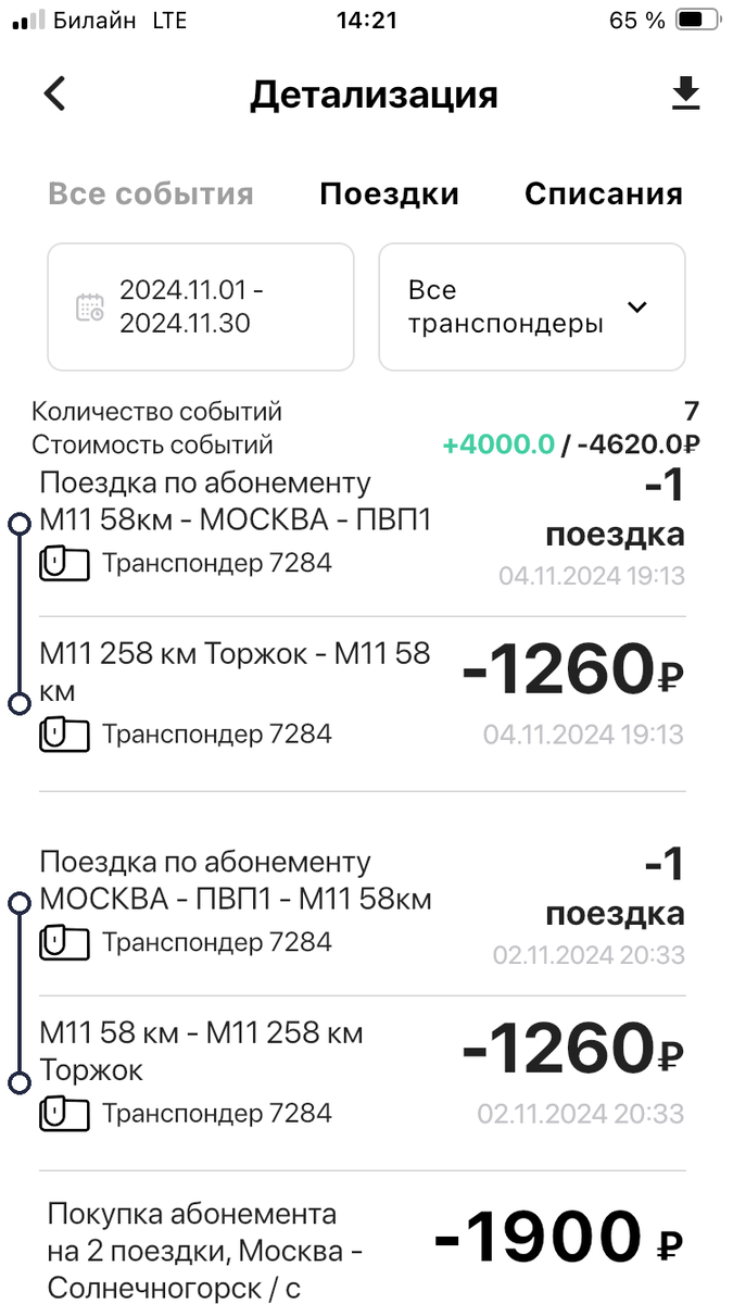 Ниже – для примера – стоимость моей последней поездки в деревню 02-04 ноября 2024 года.