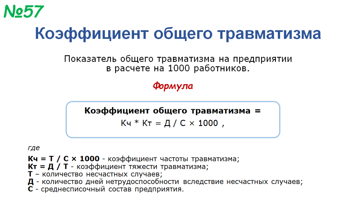 Заканчивая грустную тему о травматизме, предлагаю вам обобщенный показатель безопасности труда - коэффициент общего травматизма. Это произведение уже известных нам коэффициентов частоты и тяжести травматизма. Желаю вам здоровья и нулевых значений всех этих метрик! ТОП-100 ключевых показателей бизнеса Полная библиотека KPI Программно-методический комплекс KPI-Excel