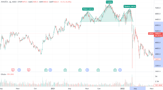 Давайте обратимся к реальному примеру. В начале 2022 года, незадолго до начала СВО, на дневном графике акций Лукойла сформировался паттерн “Голова и плечи” — известная фигура, сигнализирующая о развороте тренда. Это выглядело как пик цены (голова), окружённый двумя более низкими пиками (плечи).