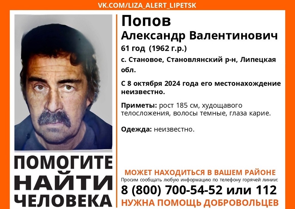 В Липецкой области больше месяца идут поиски пропавшего 61-летнего Александра Попова. 8 октября он ушел из дома в селе Становое Липецкой области. С тех пор о его местонахождении ничего не известно. Мужчина может находиться в любом районе, сообщили в поисково-спасательном отряде «Лиза Алерт» по Липецкой области. Пропавшего можно узнать по приметам: рост 185 сантиметров, худощавое телосложение, темные волосы и карие глаза. Во что был одет Александр в день исчезновения, неизвестно. Если вы видели пропавшего или что-то знаете о его возможном местонахождении, то обязательно сообщите об этом по телефонам — 112 или 8 (800) 700-54-52.