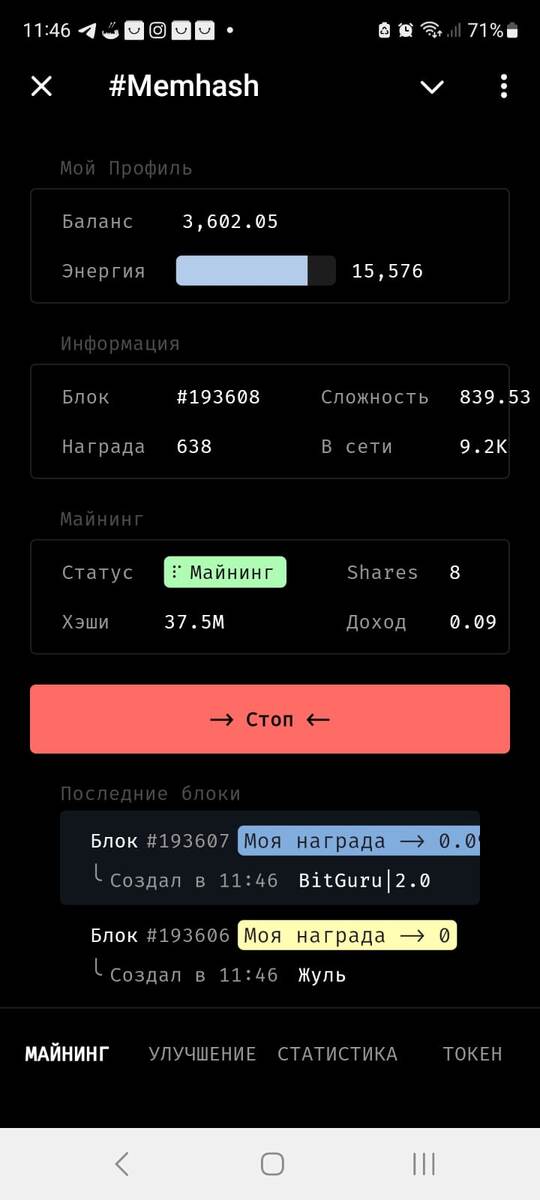 Новая топовая игра в Telegram - MemHash. MemHash — приложение, а по сути это знакомый нам майнинг с использованием реальных мощностей вашего устройства в формате MiniApp. А вот и хорошая новость от Memhash Community получена синяя галочка (https://t.me/memhash/27) : 🪙 Мы официально прошли проверку! Спасибо за доверие. ➕ В честь этого мы временно снизили вступительный взнос до 600 звезд. Кроме того, ваши рефералы получат бонус в размере +4500 максимальной энергии! Сколько продлится акция неизвестно, поэтому если вы хотите поучаствовать в проекте создателя приложения Telegram Major, поспешите, майнеров пока всего 35.500, еще можно быть в числе первых. В проекте всего 1 миллиард монет, которые планируют добыть до конца года. На данный момент добыто 11% от общего объема. Всего можно будет майнить первые 1 миллион блоков. Награды за блоки будут постепенно увеличиваться, начиная с 100 токенов и доходя до 3.715 токенов за блок, чтобы уравнять пользователей, начавших майнить позднее. Добыч