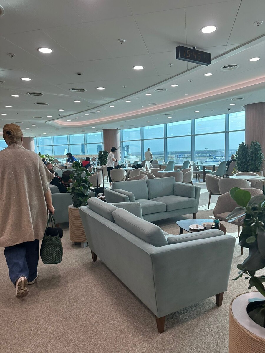 Посетила данный бизнес зал в те часы, когда вход сюда по программе лояльности банка НЕ возможен, а это: с 07 до 09, с 13 часов до 16, с 20 до 23 часов. Это нужно учитывать. Заплатила 4000 рублей и теперь делюсь своими впечатлениями! По сути - это единственный бизнес зал в Аэропорту Домодедово в зоне международных рейсов. И сделаны эти временные ограничения неслучайно. Объясняю почему. Например, в 16:50 вылетает рейс авиакомпании Emirates в Дубай, на крутом двухэтажном самолете. На борту есть бизнес и премиум класс. Вот и купил крутой дядя себе билет до Дубая первым классом за 800 тыс. рублей, у него уже автоматически включен будет доступ в этот бизнес зал. И чтобы таким пассажирам было комфортно, и в бизнес зале была действительно атмсофера "бизнес" - спокойное и комфортное ожидание своего рейса без толп туристов, чуть более лучшее питание ( бутерброды с красной рыбой и тп), и были сделаны данные ограничения. Но ели вы все равно хотите пройти в эти часы, то можно это сделат