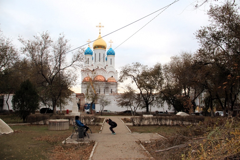 В центре Астрахани есть немало уютных уголков для отдыха горожан и туристов. Далеко не все из них в приличном состоянии. Пожалуй, самая тяжкая участь тотального запустения постигла сквер Наташи Качуевской, расположенный в створе одноимённой улицы и улицы Калинина. После преступного уничтожения большевиками расположенного на этом месте Крестовоздвиженского храма здесь посадили деревья и обустроили бомбоубежище, входившее в систему гражданской обороны. В 90-х потерявшее свой функционал подземное помещение облюбовали местные рокеры, воссоздав там соответствующую жанру атмосферу. Затем в подземелье расположился книжный склад. Но вот уже не первое десятилетие люки бывшего бомбоубежища задраены, но мальчишки, живущие в округе, рассказывают, что неоднократно бывали в этом неприглядном месте, пережившем пожар. В 1994 году на месте храма был установлен Поклонный Крест, посвящённый создателям славянской письменности, равноапостольным братьям Кириллу и Мефодию. Этот памятник был создан Вячеславом