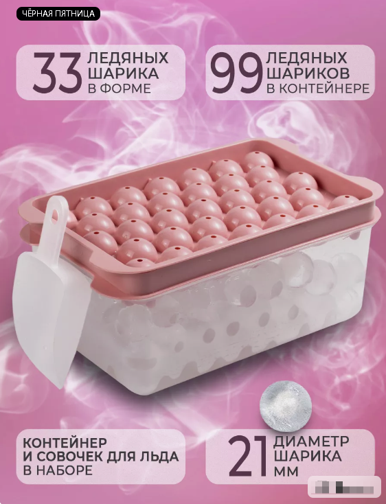 Форма на 33 ледяных шарика, а в контейнер помещается 99 шариков льда.