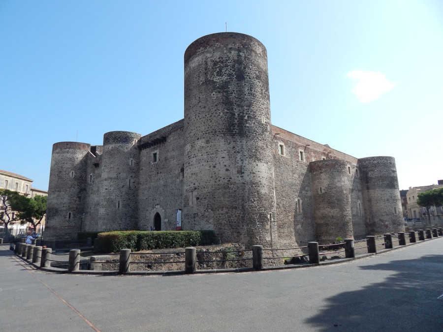 Изначально замок стоял на возвышенности у моря и контролировал подступы к городу с воды. Во время извержения Этны 1669 года город накрыла раскалённая лава. Замок спасла высота, но теперь он стоит в километре (!) от воды. Можно себе представить силу извержения.