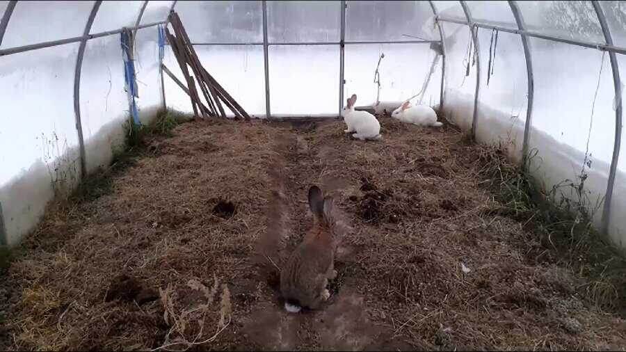 Кролики отлично роют норы, поэтому они могут выскочить наружу. Если под вашей теплицей возведен фундамент, тогда не беспокойтесь. В остальных случаях возведите своеобразный барьер: закопайте в землю любой прочный (но безопасный для животных) материал метр в глубину. Также обязательно защитите поликарбонат — достаточно растянуть на каркас спанбонд или пленку.