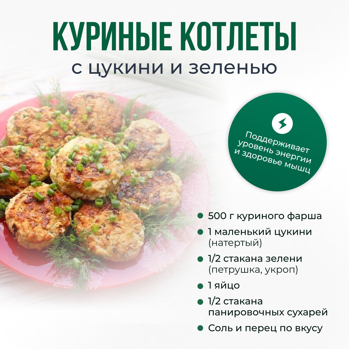 Эти котлеты помогают поддерживать уровень энергии и здоровье мышц благодаря высокому содержанию белка. Ингредиенты: 500 г куриного фарша 1 маленький цукини (натертый) 1/2 стакана зелени (петрушка, укроп) 1 яйцо 1/2 стакана панировочных сухарей Соль и перец по вкусу Инструкция: В миске смешайте куриный фарш, натертый цукини, зелень, яйцо, панировочные сухари, соль и перец. Сформируйте котлеты и обжаривайте на сковороде до золотистой корочки. Изюминка: Добавьте в массу немного тертого сыра для более насыщенного вкуса. Куриные котлеты с цукини — это питательное и вкусное блюдо, богатое белком, идеально подходящее для обеда или ужина. Наслаждайтесь их нежным вкусом и полезными свойствами!