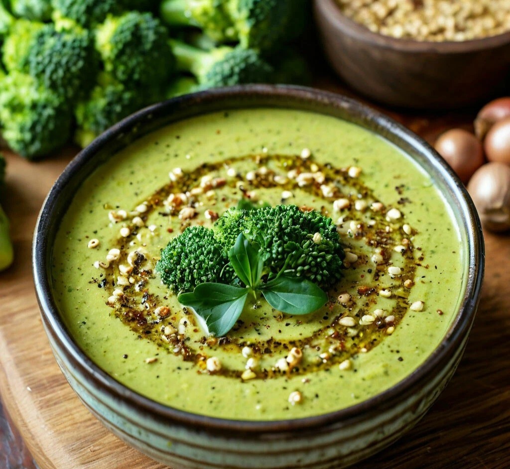 Здравствуйте дорогие читатели,сегодня мы вам расскажем как готовится один из самых полезных и в тоже время вкусных супов. Приготовление занимает около 30 минут. Калории:71 Ингредиенты: Брокколи - 400 г Лук репчатый - 80 г Масло сливочное - 30 г Соль - по вкусу Перец черный молотый - по вкусу Сливки 33% - 100 мл Сухарики - 20 г Зелёное масло - 10 мл Сыр твердый - 20 г Масло растительное - 10 мл Вода - 200 мл Способ приготовления: Шаг 1: Лук репчатый - 80 г Масло сливочное - 30 г Масло растительное - 10 мл Лук нарежьте средним кубиком и обжарьте на разогретом сливочном и растительном маслах до золотистости. Шаг 2: Брокколи - 400 г Вода - 400 мл Брокколи нарежьте на небольшие соцветия, переложите в кастрюлю. Залейте стаканом воды, накройте крышкой и варите 10 минут. Шаг 3: Соль - по вкусу Добавьте к брокколи лук, соль и пробейте блендером в пюре. Шаг 4: Сливки 33% - 100 мл Влейте в пюре сливки и доведите до легкого кипения на плите. Шаг 5: Зелёное масло - 10 мл Сухарики - 20 г Сыр т
