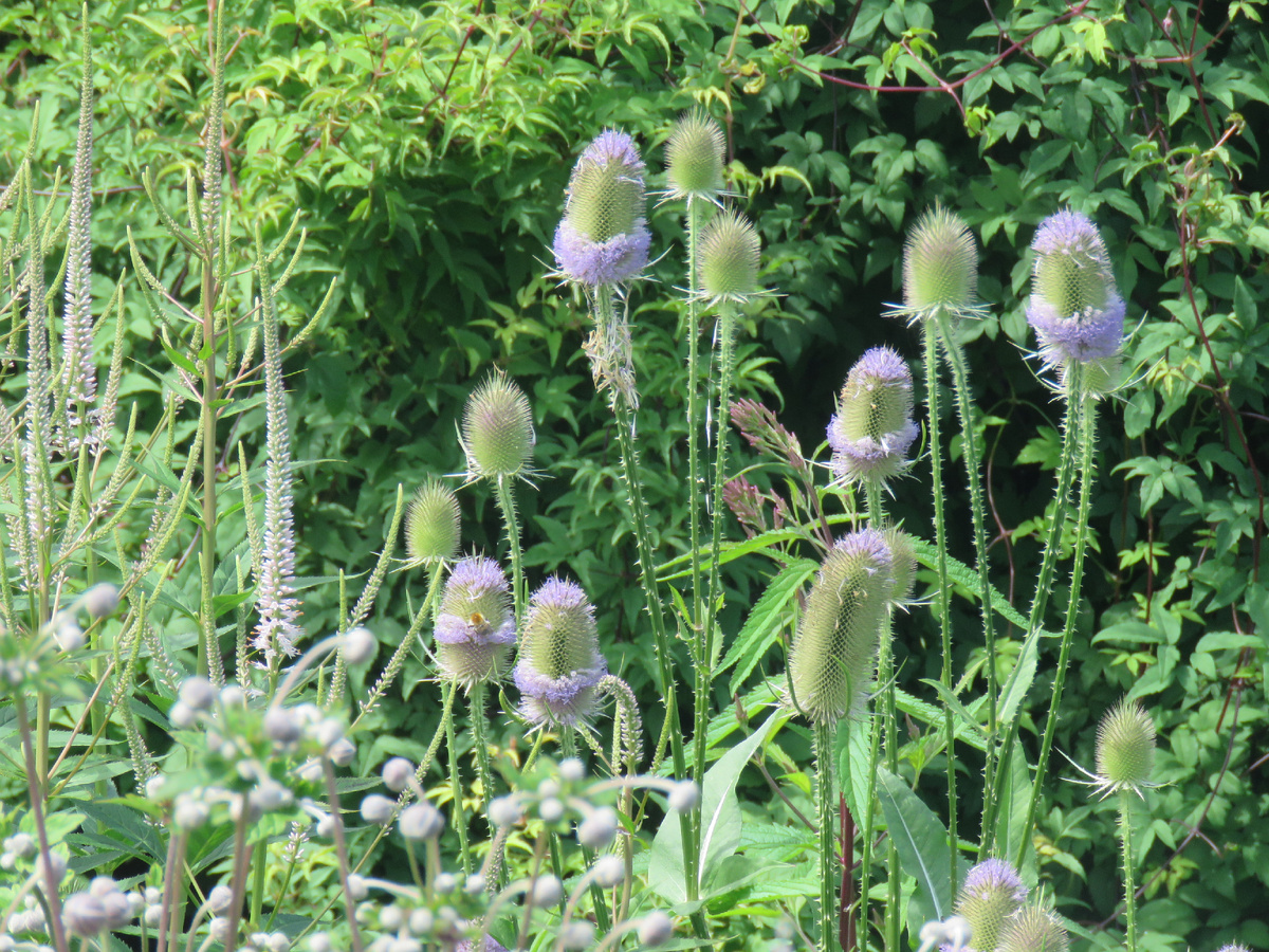 Двулетние растения в саду эта такая штука, которая структуру сада меняет неожиданно и делает ту структуру нестабильной. И я не про мелочь подножную, типа виол, а про что-то более брутальное. Про ворсовальную шишку, например. Лично мне нравится сеять растения с таким циклом жизни в июне. В горшок и в парник (ну, или что там этот девайс в саду заменяет). Но именно эту девицу я не сеяла, я просто "волевым" решением соблазнила подругу на это действие🤣 Она посеяла, мне выдала 2 штуки уже в виде рассады. (да, иногда пользуюсь своим положением). В первый сезон шишка сия жила в виде небольшой прикорневой розетки, туся в дальних зарослях. А что? Я ее так-то живьем видела😁. С того момента и впечатлилась. Но семена нам попались только лет через пятнадцать. На второй год своего существования, шишка (будем ее "ворсянкой" кликать) начала отращивать стебли из той перезимовавшей розетки. Увы, одной. Вторая решила не продолжать свое существование по какой-то причине. И я поняла, что обходить владе