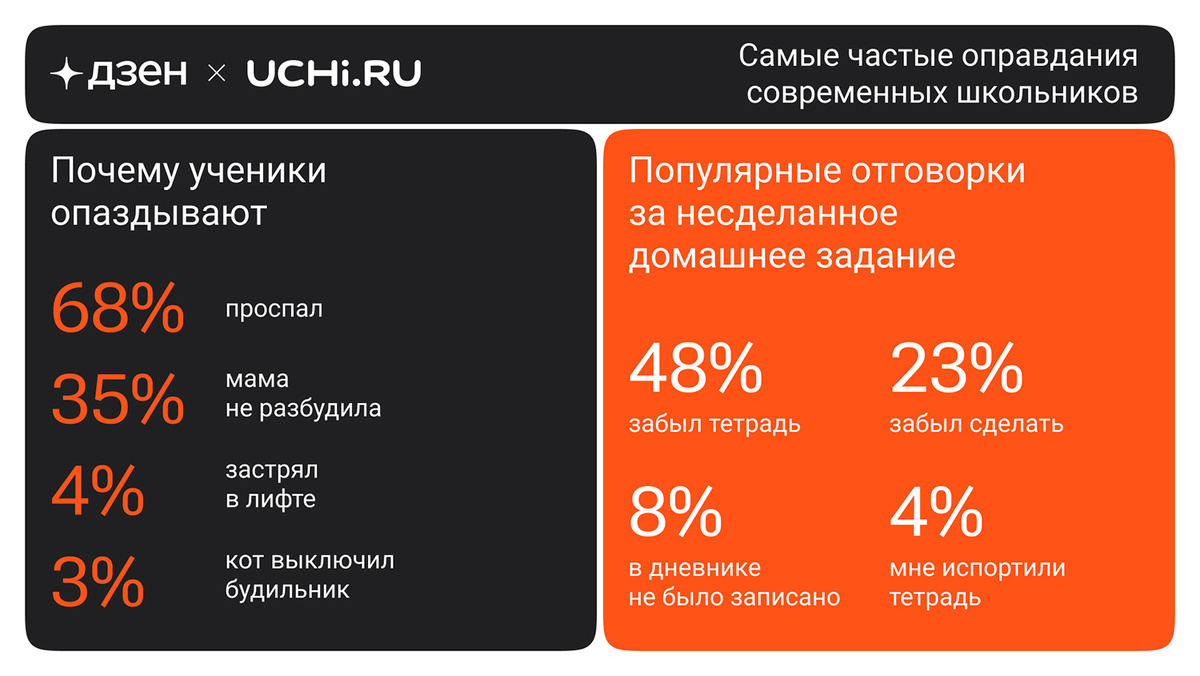 Согласно исследованию, большинство опрошенных педагогов (61%) отметили, что в их классах есть ученики, которые регулярно опаздывают. При этом самые популярные оправдания при опоздании – «Проспал» (68%) и «Мама не разбудила» (35%). Реже встречаются более креативные объяснения, такие как «Застрял в лифте» (4%) и «Кот выключил будильник» (3%).