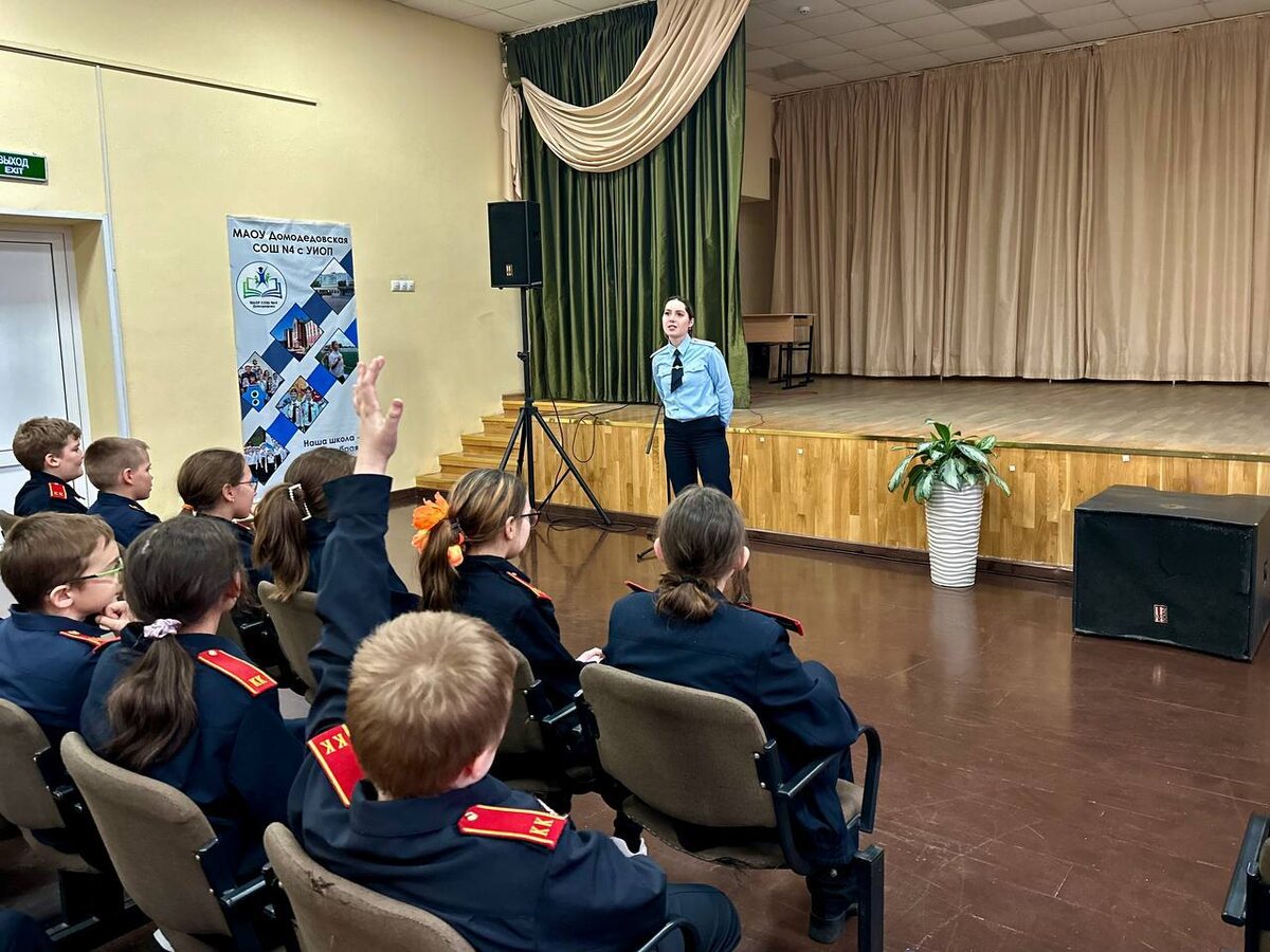 В рамках акции «Нет ненависти и вражде!» сотрудница отдела участковых уполномоченных полиции и по делам несовершеннолетних Кристина Ласточкина разъяснила ученикам кадетских классов понятия «экстремизм», «терроризм» и «ксенофобия». Она привела примеры их проявлений в обществе.