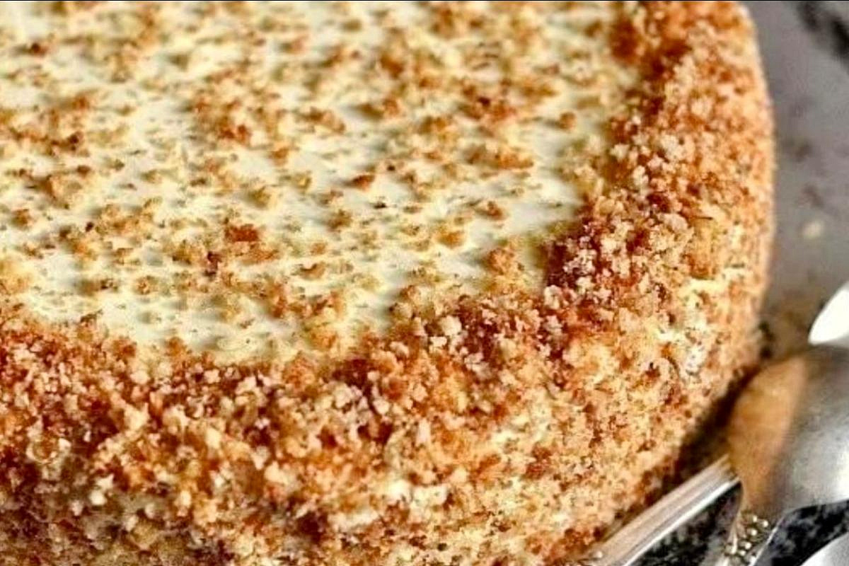 3. Приготовление крема: Взбейте мягкое сливочное масло со сгущённым молоком до однородности. Промажьте коржи кремом, соберите торт и также покройте кремом сверху и по бокам. Украсьте края крошкой из обрезков торта.