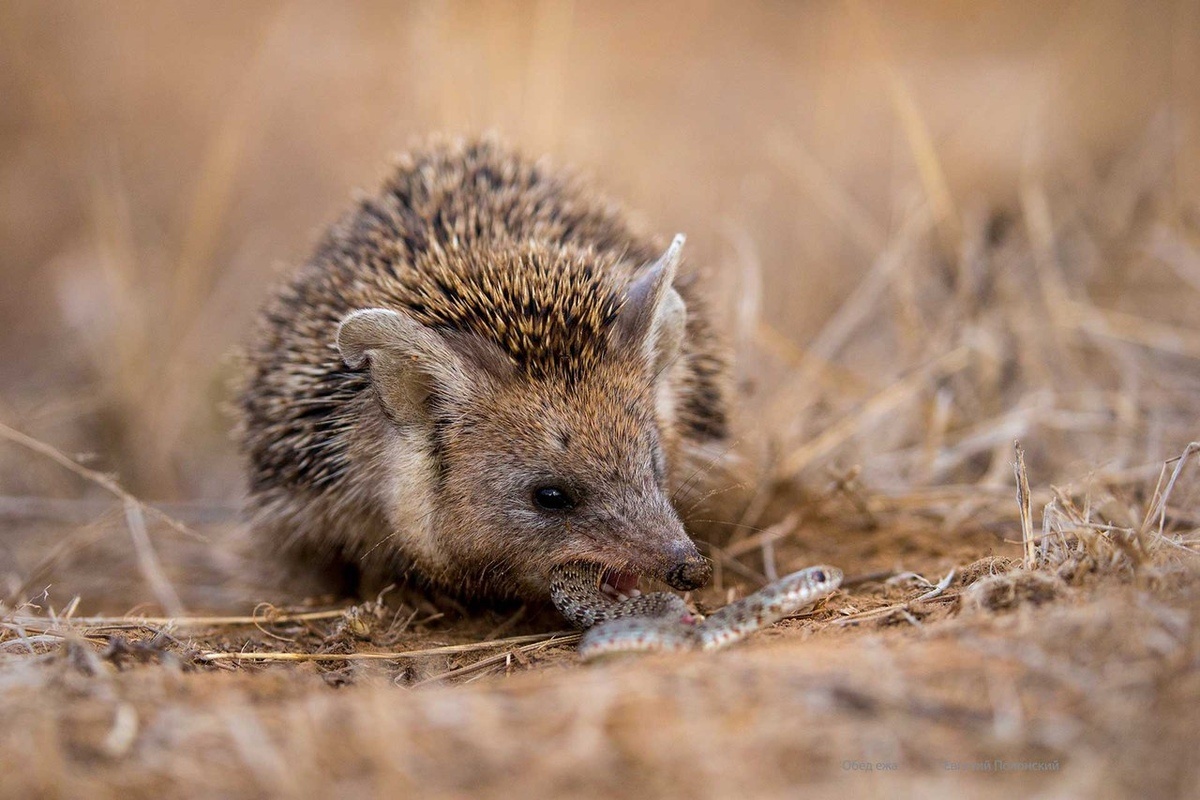 Фото: Ёж ушастый, Евгений Полонский С наступлением холодов обитатели Астраханского заповедника активно готовятся к зиме. Ушастые ежи методично нагуливают жир, питаясь насекомыми, и обустраивают тёплые норы, устланные листьями, в которых они будут проводить зимнюю спячку. Летучие мыши, такие как двухцветный кожан и другие виды, отправляются в дальние миграции или находят утеплённые убежища в постройках и дуплах деревьев. Ондатры не впадают в спячку, зато мастерски строят хатки и делают запасы из корневищ растений. Они питаются в специально оборудованных местах, в зависимости от времени года и ледового покрова. Обыкновенная полёвка собирает до 3 кг корма, не впадает в спячку и проявляет круглосуточную активность зимой. Она прокладывает норы между землёй и снегом, питаясь корой и семенами. Тамарисковая песчанка – чемпион по запасливости: на зиму заготавливает до 5 кг семян и сухих растений, создавая глубокие норы. Мышь домовая строит норы с уютными гнездовыми камерами и зимует в стогах и