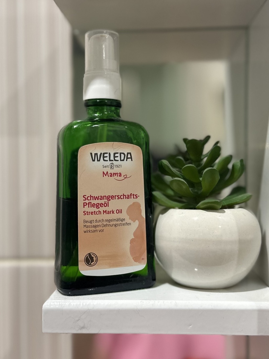 Растяжки, отеки, сухость кожи, что только не подстерегает будущую маму во время беременности. При чем все это может настигнуть почти сразу или наоборот в последний момент. Судя по информации из интернета, статей врачей и отзывов мамочек первое с чем боится столкнуться каждая - это растяжки. Рекомендации врачей в этом вопросе в основном сводятся к рекомендациям правильно питаться, вести здоровый образ жизни, выполнять легкие физические упражнения и соблюдать режим сна. Для себя я выбрала масло для профилактики растяжек от давно зарекомендовавшей себя фирмы Weleda. Больше всего в этом продукте меня привлек натуральный состав: Применять его я начала с первых дней беременности. Каждый раз после душа я разогреваю в ладошке небольшое количество масла и наношу на кожу живота и бока. Сейчас я на 7- м месяце и пока нет намеков на появление растяжек. Будем надеяться, что так пойдет и дальше. Следующая трудность с которой мы можем столкнуться это сухость кожи тела. Кажется что когда ты равн