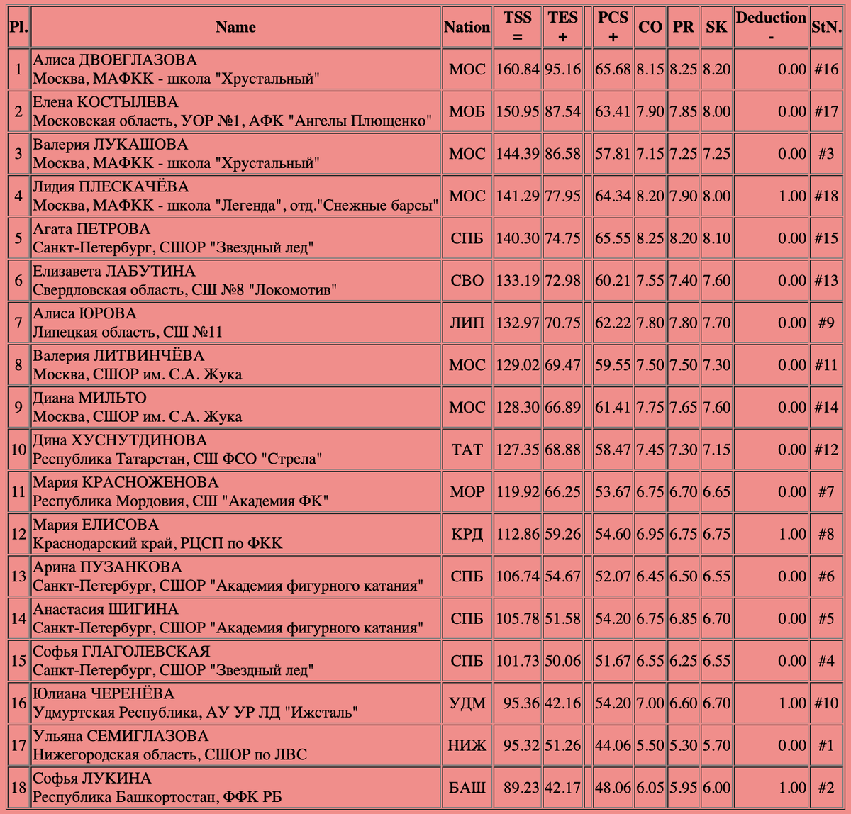 Завершились соревнования среди юниоров "Мемориал А. А. Горшкова" в Москве. Этап был знаменателен тем, что здесь должно было пройти одно из главных противостояний среди девушек в этом сезоне - Базылюк против Костылевой. Но, к сожалению, Маргарита с этапа снялась, и будет заявлена на этап в Санкт-Петербурге в следующие выходные. Базылюк на этом этапе заменила серебряный призер прошлого этапа - Алиса Двоеглазова, а еще как заменила! Алиса достойно откатала обе программы и по праву выиграла соревнования в Москве. Итоговая таблица выглядит следующим образом: Мне довелось увидеть сильнейшую разминку с трибун, поэтому поделюсь немного своими впечатлениями. Начну с того, что безумно обидным было выступление в короткой программе Валерии Лукашовой. К сожалению, отсутствие каскада отбросило ее на далекое 16-е место после КП. Зато в ПП Лера выступила на ура, исполнив два ультра-си, и забравшись на 5 итоговое место. Очень мне понравилась Лукашова сегодня. Протокол Валерии: Не могу не отметить, что