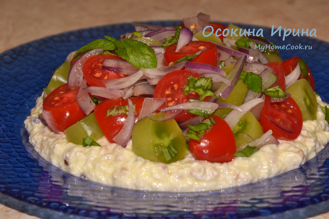 Сегодня решила приготовить салат, где соус не просто заправка, а полноценный ингредиент салата. Получилось вот что: 1 красную луковку порезала короткой соломкой вдоль, присолила, помяла и оставила на 10 минут, чтобы лучок обмяк. Для соуса в миске смешала 100 г творожного сыра, 1 ст.л. зернистой горчицы, 3 ст.л. оливкового масла и 1 ч.л. лимонного сока и промешала-подвзбила до густой пюреобразной консистенции. 200 г разноцветных помидорчиков черри порезала, добавила подготовленный лук, немного резаного базилика и промешала. На тарелку уложила соус, поверх выложила салатик и сразу подала. Ооочень вкусно и насыщенно) Приятного аппетита