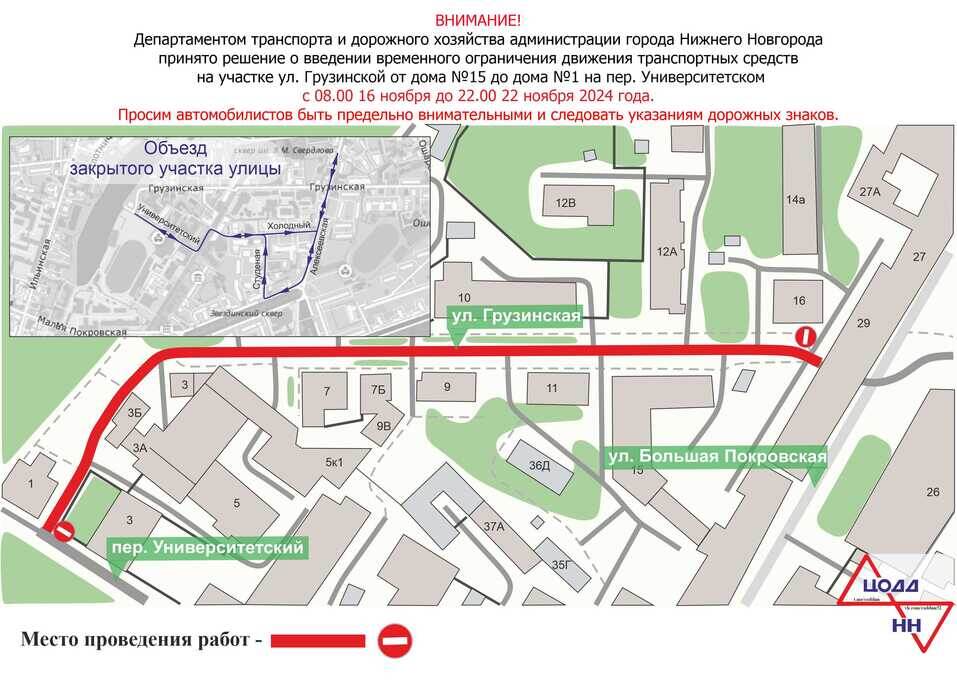 С 8:00 16 ноября по 22:00 22 ноября 2024 г. в Нижнем Новгороде будет запрещено движение транспорта по улице Грузинской. Речь идет об участке от дома №15 до дома №1 на Университетском переулке. По данным городского департамента транспорта и дорожного хозяйства, на Грузинской будет проводиться ремонт проезжей части. Объехать зону работ можно будет по улицам Алексеевской, Звездинке, Студеной, Большой Покровской, Холодному и Университетскому переулкам (в обоих направлениях). Подъезд к домам жителей улицы Грузинской будет организован подрядчиком. Ранее NN.DK.RU писал, что в Нижнем Новгороде выделили на ремонт автомобильных дорог по улицам Грузинской и Пискунова более 313 млн руб.