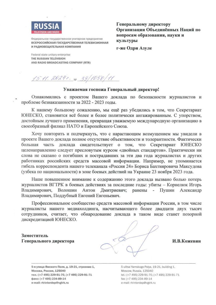 ВГТРК: доклад по безопасности журналистов в 2022-2023 гг дискредитирует ЮНЕСКО