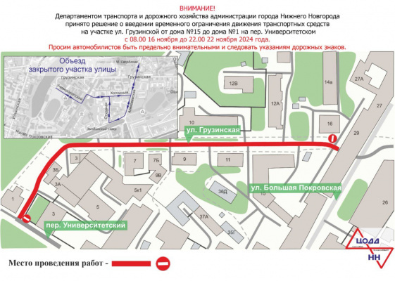 С 8.00 16 ноября до 22.00 22 ноября будет перекрыт проезд на участке ул. Грузинской от дома №15 до дома №1 на пер. Университетском