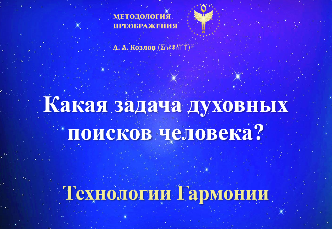 «Технологии Гармонии» Какая задача духовных поисков человека? Как я могу практически закрепить накопленные знания? Как правильно организовать свое бытие? Чему я могу научиться благодаря методологии «Технологии Гармонии»? На вопросы отвечает Александр Анатольевич Козлов – автор Методологии Преображения. «Задача духовных поисков человека - перейти от жизни физического тела к жизни духа в физическом теле. Такое преображение проявится состоянием глубокого спокойствия, силой, уверенностью и мудрым отношением к событиям жизни. Но только накоплением знаний ничего не достичь в духовном мире. Необходимо: Во все времена человеку, вступившему на путь познания, была необходима гармония тела, души и духа. Физическое тело - место приложения и проявления силы, качество которой и характер зависят от мыслей и внутренних скрытых движений души. «Психологические факторы формирования идеального здоровья тесно связаны с духовными факторами, лежат в русле системы непрерывного расширения сознания и творческой