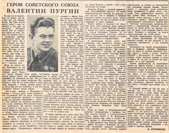 21 Апреля 1940 года газета «Правда» сообщила читателям, что за образцовое выполнение боевых заданий Командования на фронте борьбы с финской белогвардейщиной и проявленные при этом отвагу и геройство 15 офицерам РККА присвоено звание Героя Советского Союза с вручением ордена Ленина и медали Золотая Звезда. Младший командир Пургин Валентин Петрович шел в списке десятым.