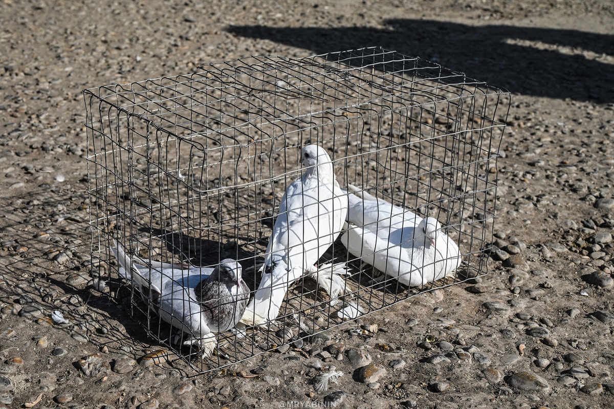 Про то, как я чуть не лишился фотокамеры в Узбекистане, отправившись на этот самый птичий рынок, расскажу чуть позже, а пока расскажу как выглядит сам птичий рынок, расположенный в паре шагов от большого городского рынка, то есть, за той самой "Великой Бухарской Стеной". Начнем с того, что это действительно ПТИЧИЙ рынок, а не вот это все, что было у нас на Таганке. Основной контингент бухарской птички – птицы, и больше всего здесь голубей. Попытался спросить у одного из продавцов, почему тут столько голубей, но он просто пожал плечами: то ли не понял, то ли просто не знает ответа. "Давно сидим" (с). Если голубей здесь процентов 80, причем самых разных расцветок и пород, то остальных птиц совсем мало, и это в основном попугаи, плюс еще пара разных птичек, пород которых я даже примерно разобрать не смог. Ну не орнитолог я, простите. Развешанные в тени клетки с птицами напомнили мне Китай. Там я наблюдал как почтенные старцы играли в Маджонг, а над их головами чирикали птички, принесенные
