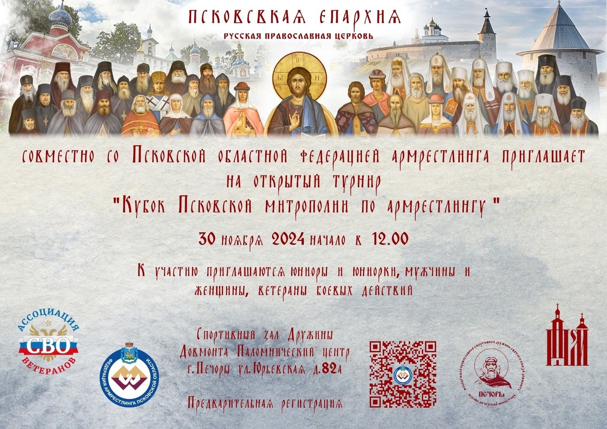 30 ноября 2024 года в Паломническом центре Псково-Печерского монастыря, по благословению Митрополита Псковского и Порховского Матфея, впервые состоится спортивный турнир «Кубок Псковской митрополии по армрестлингу». В соревнованиях примут участие юниоры и юниорки с 18 лет до 21 года включительно, мужчины и женщины, а также ветераны боевых действий. Участники будут соревноваться в разных категориях от 60 кг до 90+ кг, ветераны участвуют в двух классах PIUH* и PID** PIUH – спортсмены, соревнующиеся стоя, свободная рука фиксируется на туловище. ** PID – спортсмены, передвигающиеся на инвалидной коляске и соревнующиеся сидя. Начало соревнований в 12:00. Группа мероприятия: https://vk.com/club228172948
