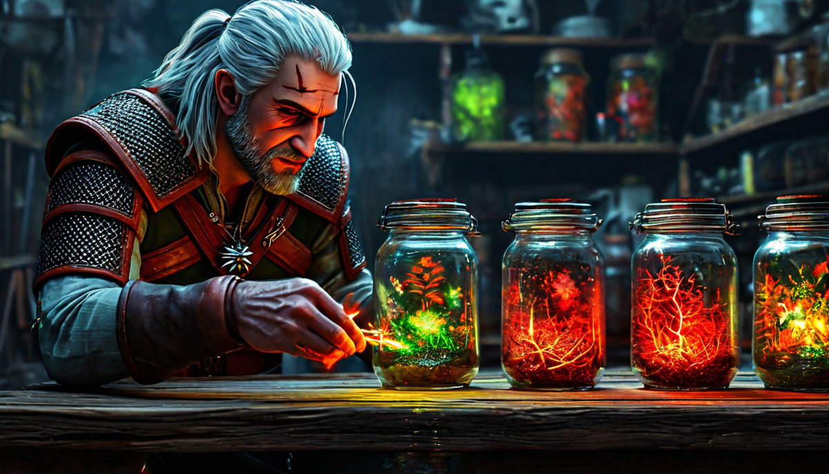 Geralt also used his skills in alchemy to craft these bоmbs. By combining ingredients from the world around him, he could create powerful explosives. Before heading into battle, he drank a potion to enhance his senses and reaction time. With the potion strengthening his body, Geralt was ready for action.