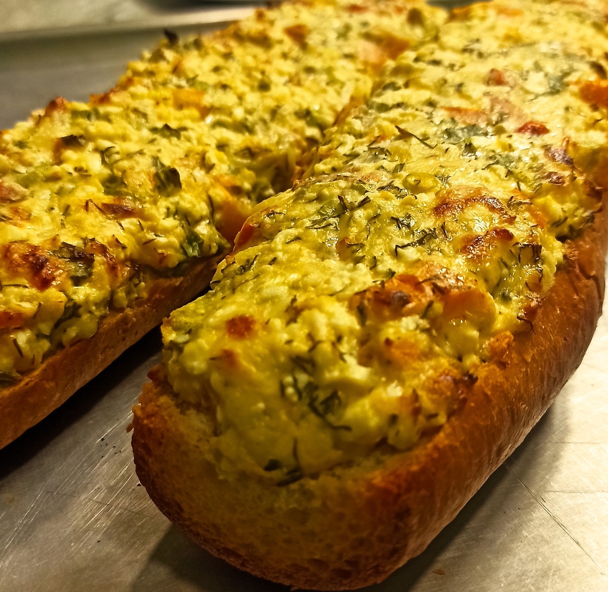 Я продолжаю собирать ребенку обеды в школу и соответственно делиться рецептами с вами. Этот бутерброд сыну очень понравился, рекомендуем. А мне в плюс то, что смогла использовать вчерашний багет. Они ведь вкусные только по свежести - в первые сутки после приготовления, а потом становятся резиновыми и не особо приятными. Так что рецепт отличный. Итак, приступим. Для начала нужно подготовить следующие ингредиенты: Приготовление достаточно простое и быстрое: В глубокую миску пересыпаем творог. Зелень мелко нарезаем и добавляем к творогу. Далее натираем на крупной терке сыр. У помидор нужно убрать семена, чтобы они не давали лишнего сока. А после нарезать небольшими кусочками мякоть. Следом натираем на мелкой терке чеснок и добавляем соус. Соус я делала из сметаны и творожного сыра с добавлением специй - копченая паприка и смесь для курицы. Но вы можете взять другие. Хорошо перемешиваем смесь и разрезаем батон вдоль. Начинку выкладываем на багет. Перекладываем бутерброды на