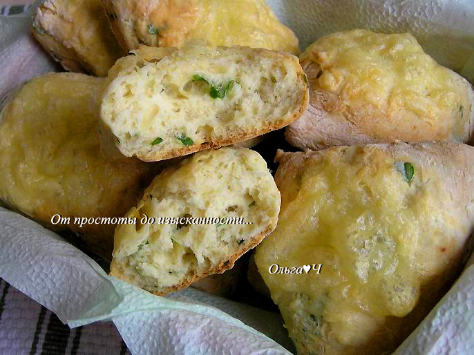 0,5 ч. л. соли Приготовление: Просеянную муку смешайте с зеленью, содой и солью. Влейте пахту (или молоко). Замесите тесто. Добавьте еще муки при необходимости, но не слишком много, тесто должно чуть липнуть к рукам. Присыпьте рабочую поверхность мукой и сформируйте пласт, толщиной около 2 см, разрежьте на 8 частей. Переложите заготовки на противень, застеленный бумагой для выпечки, сверху выложите тертый сыр. Выпекайте при 250*С 10 минут, затем снизьте температуру до 200*С и выпекайте еще 10 минут. Ориентируйтесь н