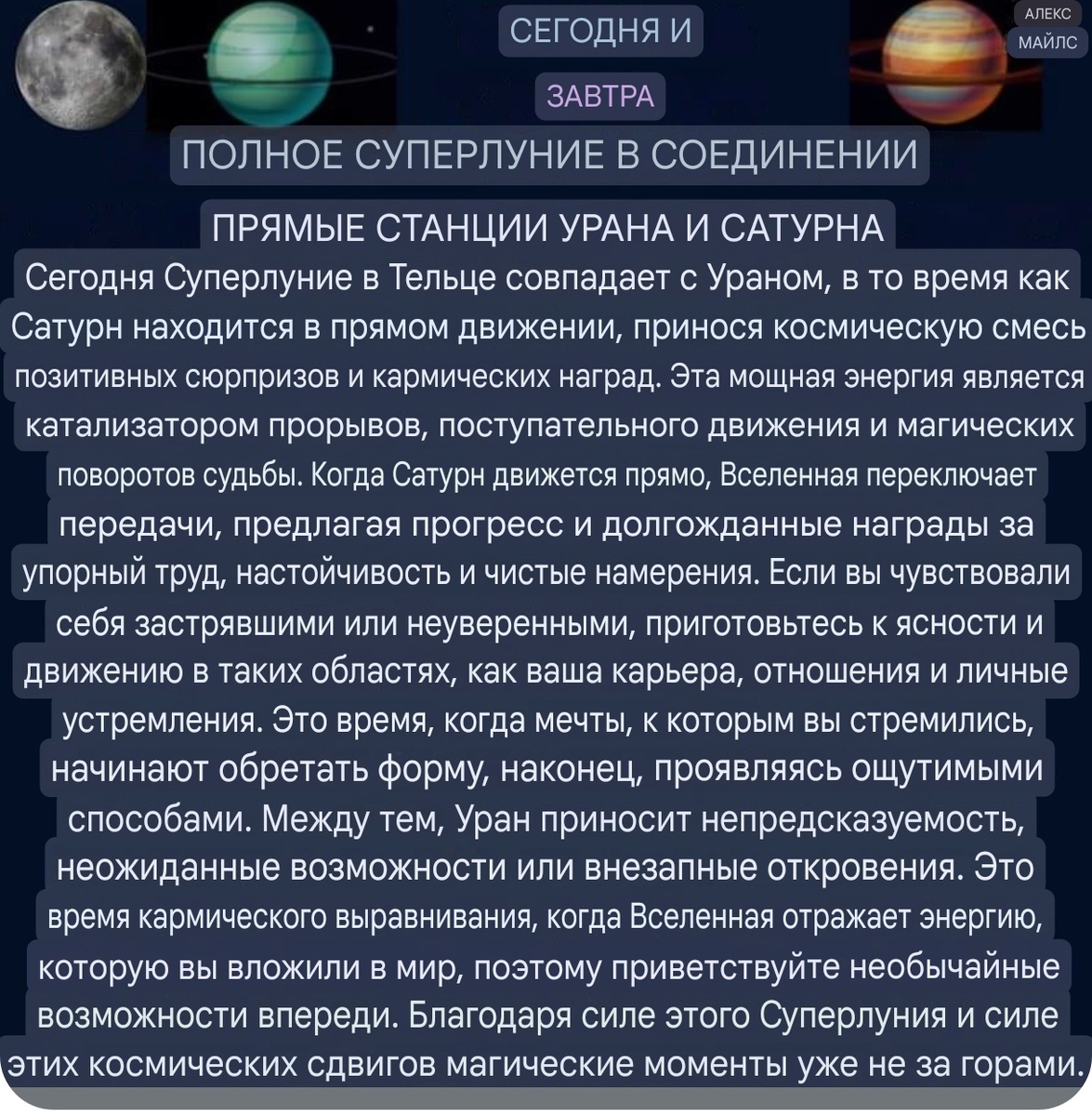 Сегодня редкое и мощное выравнивание дисциплины, трансформации и пробуждения. Устойчивая, движущая вперед энергия Сатурна сочетается с электризующим блеском Суперлуния в Тельце и инновациями Урана, чтобы создать идеальные условия для роста. Независимо от того, отпускаете ли вы прошлое, делаете шаг в неизвестность или устанавливаете смелые новые намерения, верьте, что Вселенная направляет вас к вашему наивысшему потенциалу. Возможности безграничны, и сегодня вечером в воздухе витает магия. ~ Алекс Майлз