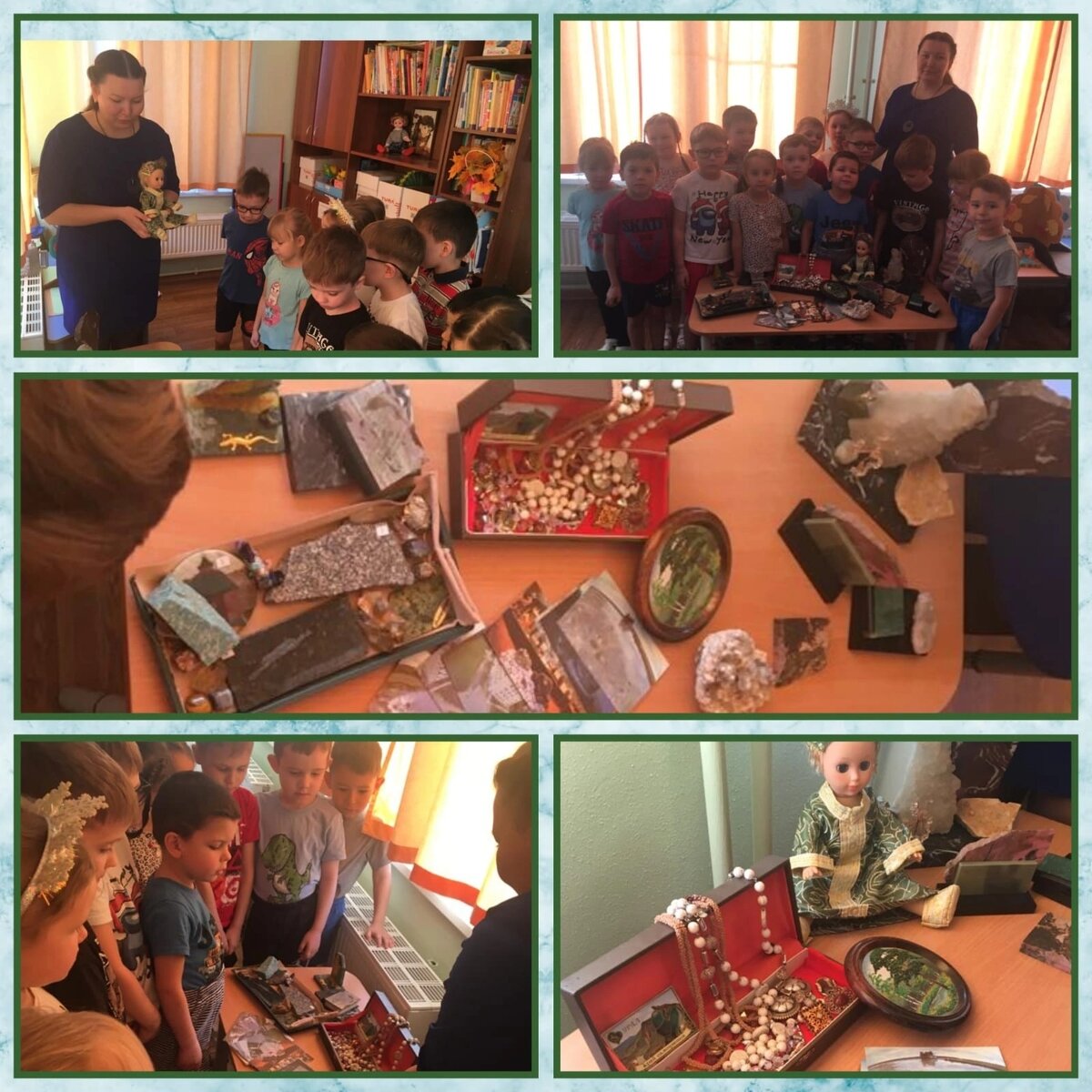 Экскурсия для воспитанников старших и подготовительных групп. Педагог рассказала ребятам о добыче золота в нашем городе и другой ценной руды. Ребята рассмотрели камни, а так же познакомились с изделиями , изготовленными из различных камней. Вспомнили кто такая Хозяйка медной горы в каких сказках о ней писал Павел Бажов.