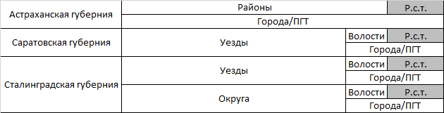 Несмотря на то, что это три соседствующие губернии, внутреннее устройство у них развивалось по разному. Так, в Астраханской губернии переход на районное деление был совершён уже в 1925. В Саратовской губернии структура осталась той же, губерния делилась на уезды, а уезды - на волости. В Сталинградской губернии же при сохранении волостей, межуровневое пространство было гибридным. Территории, переданные от Саратовской и Астраханской губернии делились на уезды, а переданные территории Донской области - на округа.