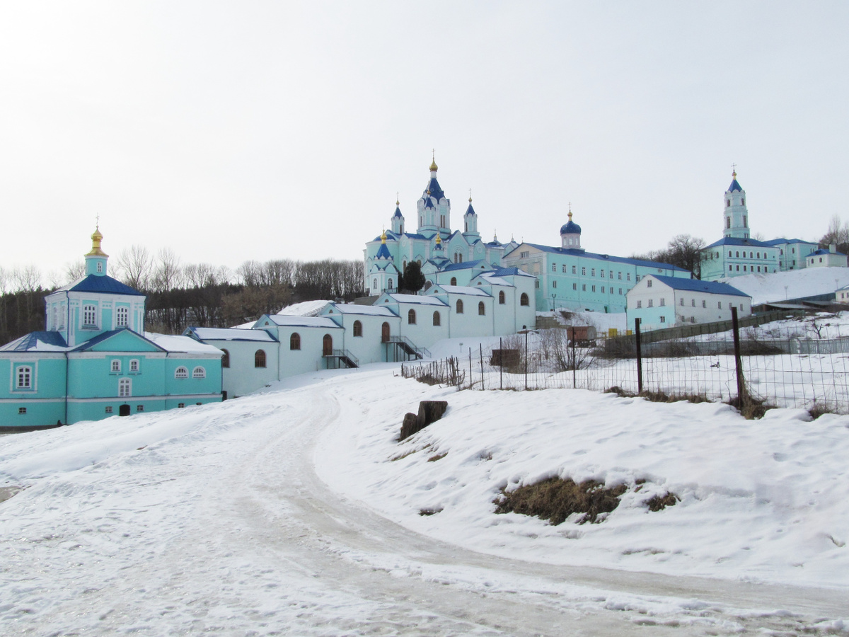 Старая поездка, аж 2013 года, 8 марта. Вот как надо правильно отмечать праздники. Шутка. Впрочем, нет. Поехали мы с друзьями посмотреть на Курские земли. На три дня. Первым делом прибыли поклониться святыне Курских земель - иконе Знамения Пресвятой Богородицы, эту икону еще называют Курская Коренная. Находится эта святыня в Курской Коренной пустыни. Краткая история появления этой иконы такова. 8 сентября 1295 года случилось одному крестьянину придти по своим надобностям в лес, которым обильно поросла курская земля после набегов монголо-татар. И возле корней большого дерева на берегу реки Тускари, он увидел лежавшую икону. Когда он ее поднял, то из места, где лежала икона забил источник. Сейчас здесь сделана часовня, над этим местом. Увидя родник этот человек поставил икону в дупле дерева, а сам пошел, сказал своим товарищам о находке. Народ был благочестив и они построили часовню повыше под горой, куда и поместили икону. Сейчас на месте той часовни располагается соборный храм монастыр