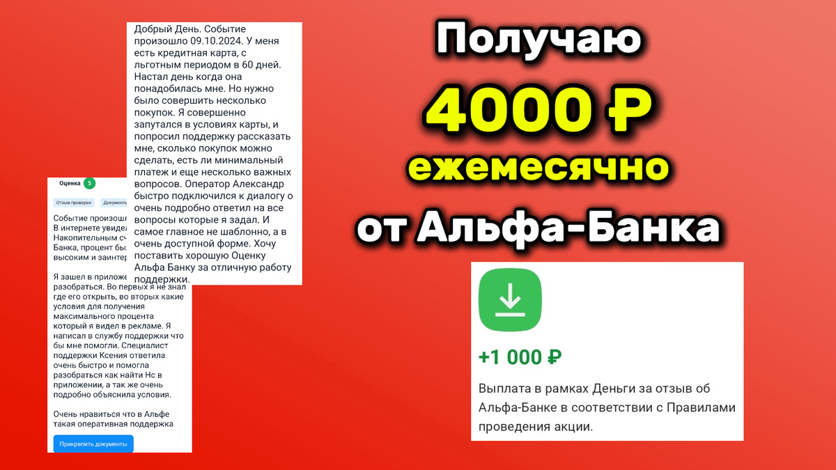 Альфа-Банк предлагает интересную возможность: за каждый одобренный отзыв на платформе Банки.ру можно получить 1000 рублей и и стать участником розыгрыша продукции Apple за простые отзывы о себе. За один месяц можно написать 2 отзыва на ресурсе Банки.ру до конца декабря 2024 года и получить за каждый по 1000 рублей в случае их принятия модераторами. 1. Деньги за отзыв перечисляют на дебетовую карту Альфа-Банка. Если нет карты, необходимо оформить по акционной ссылке, чтоб банк подарил 500 рублей при совершении любой покупки по карте. 2. В чате в мобильном приложении задала вопрос который меня интересовал (про накопительный счёт). 3. Дождалась ответа от сотрудника и сделала скрины данной переписки. 4. Зарегистрировалась на сайте Банки.ру. При регистрации номер телефона должен соответствовать номеру телефона в Альфа-Банке, иначе деньги не поступят. 5. Написала отзыв. Чтобы отзыв модераторы засчитали, нужно указывать дату и время события (например, обращения в чат), имя оператора служб