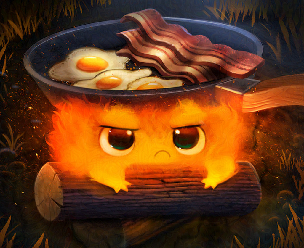 Когда все окончательно сгорело, выложите глазунью на тарелку и присыпьте кленовыми листьями, потому что кленового елея.. в смысле сиропа, у вас, скорее всего, нет.