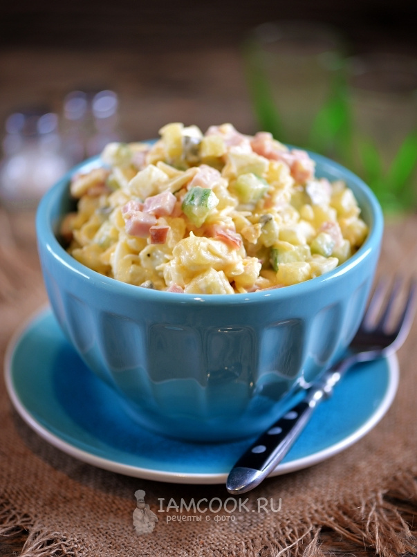 Ветчина, сыр, картошка и огурчики – всё это звучит привычно. Но только при первом знакомстве. После первой же ложки становится понятно, что этот салат – нечто особенное: вроде и русское, но с привкусом Европы (называется, кстати, Берлинским). Очень многогранный… Подходит для любого праздничного застолья! 📖 Что нам понадобится? 👩🍳 Как готовить? 1. Сварите картошку в мундире, охладите, очистите. Яйца тоже сварите вкрутую, остудите. 2. Картошку и ветчину нарежьте кубиком. Прямо представьте, что готовите блюдо для обложки журнала. Всё сложите в удобную миску. 3. Свежий и маринованный огурцы тоже превратите в мелкие кубики. Свежий огурец хрустит свежестью, а маринованный добавляет пикантности. 4. Белки рубим, как будто сдаём экзамен в шеф-повара. Желтки пока оставляем – они пойдут в заправку. Всё (кроме желтков) добавляем в общую миску. 5. Сыр трем на тёрке прямо в салатник. 6. Желтки растираем с горчицей до состояния кремовой кашицы. Вливаем сливки по чуть-чуть, как будто вы мастер бар