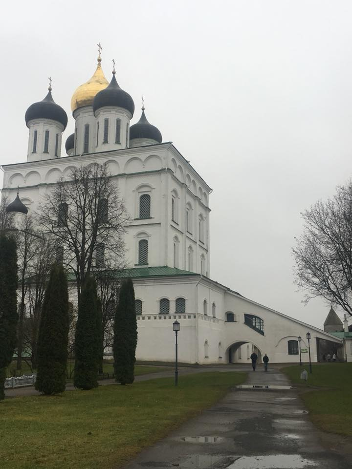 Псков. Троицкий собор. Место строительства первого храма на этом месте выбрала княгиня Ольга, посетив псковскую землю в 957 году. Как гласит летопись, когда она стояла на берегу реки, ей явилось видение в виде трёх лучей, указывающих на это место — именно поэтому храм решили посвятить Троице. Второй храм, построенный на месте сгоревшего в 12 веке, был уже каменным. В 1242 году перед началом Ледового побоища в этом соборе вместе с псковичами молился о победе над «псами-рыцарями» князь Александр Невский. Сегодняшнее, четвёртое по счёту, здание собора было построено в 1699 году, на том же месте, где стояли предыдущие храмы. В 1935 году собор закрыли, организовав в нём антирелигиозный музей. Немцы во время оккупации его открыли. Там, где сейчас ковёр, валялся сорванный со стены портрет Сталина. После войны храм уже не закрывали. В 1942 году в составе Русской православной миссии иконописец Евгений Климов приехал из Риги в Псков и написал эскиз иконы для надвратной ниши псковского Детинца п