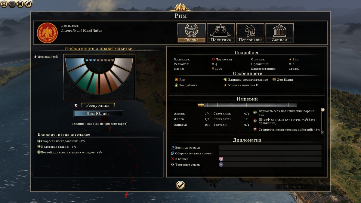 В игре Total War: Rome II был введен новый термин в играх серии - империй. Империй - показатель, выражающийся в очках, влияющий на: Чем больше растёт ваша фракция, тем труднее удержать её под контролем. Империй измеряется в очках и делится на уровни. Максимальное количество очков империя - 112. Он делится на 8 уровней. Набирается от захвата вражеских поселений или же от создания государств-сателлитов. Захват крупного города (столицы провинции) - 2 очка, захват малого поселения - 1 очко. Требуется 0 очков.