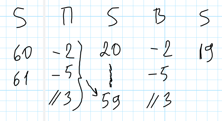 Два игрока, Петя и Ваня, играют в следующую игру. Перед игроками лежит куча камней. Игроки ходят по очереди, первый ход делает Петя. За один ход игрок может: убрать из кучи два камня или убрать из кучи пять камней или уменьшить количество камней в куче в три раза (количество камней, полученное при делении, округляется до меньшего). Например, из кучи в 20 камней за один ход можно получить кучу из 18, 15 или 6 камней. Игра завершается, когда количество камней в куче становится не более 19. Победителем считается игрок, сделавший последний ход, то есть первым получивший кучу, в которой будет 19 или меньше камней. В начальный момент в куче было S камней, S ≥ 20. Будем говорить, что игрок имеет выигрышную стратегию, если он может выиграть при любых ходах противника. Укажите минимальное значение S, при котором Петя не может выиграть за один ход, но при любом ходе Пети Ваня может выиграть своим первым ходом. Позиции, при которых Петя выиграет за 1 ход: от 20 до 59. Значит по