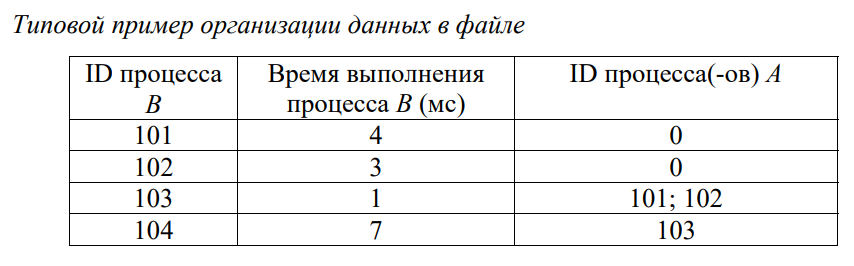 В файле содержится информация о совокупности N вычислительных процессов, которые могут выполняться параллельно или последовательно. Приостановка выполнения процесса не допускается. Будем говорить, что процесс B зависит от процесса A, если для выполнения процесса B необходимы результаты выполнения процесса A. В этом случае процессы A и B могут выполняться только последовательно. Информация о процессах представлена в файле в виде таблицы. В первом столбце таблицы указан идентификатор процесса (ID), во втором столбце таблицы – время его выполнения в миллисекундах, в третьем столбце перечислены с разделителем «;» ID процессов, от которых зависит данный процесс. Если процесс независимый, то в таблице указано значение 0. Определите максимальную продолжительность отрезка времени (в мс), в течение которого возможно одновременное выполнение максимального количества процессов при условии, что все независимые друг от друга процессы могут выполняться параллельно и время окончания